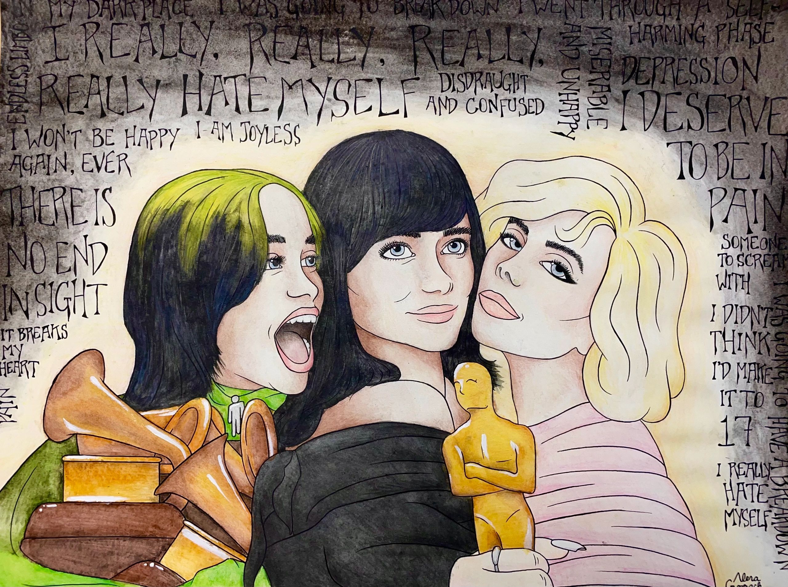 Art exhibition theme: "Windows." I focused on singer-songwriter Billie Eilish, who overcame depression by making music and thus furthered her career. Eilish’s emotional songs and interviews are a window into her inner demons and her new successes despite them. She won five Grammy awards in 2019 (left), was the youngest-ever Met Gala host in 2021 (right), and was the first artist born in the 21st century to win an Academy Award in 2022 (middle). The three glowing milestones in front of Eilish’s dark quotes from earlier years illustrate her journey from complete hopelessness to peace of mind.